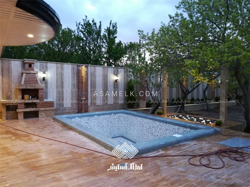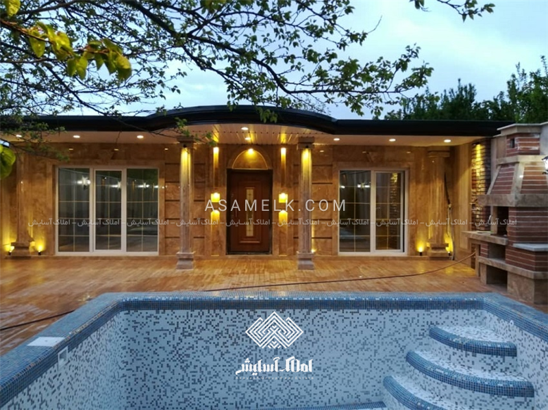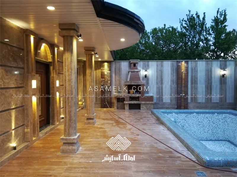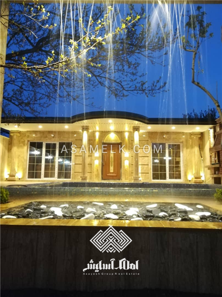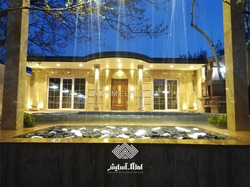 آبنمای زیبا در مجاورت ویلا و استخربه همراه نورپردازی