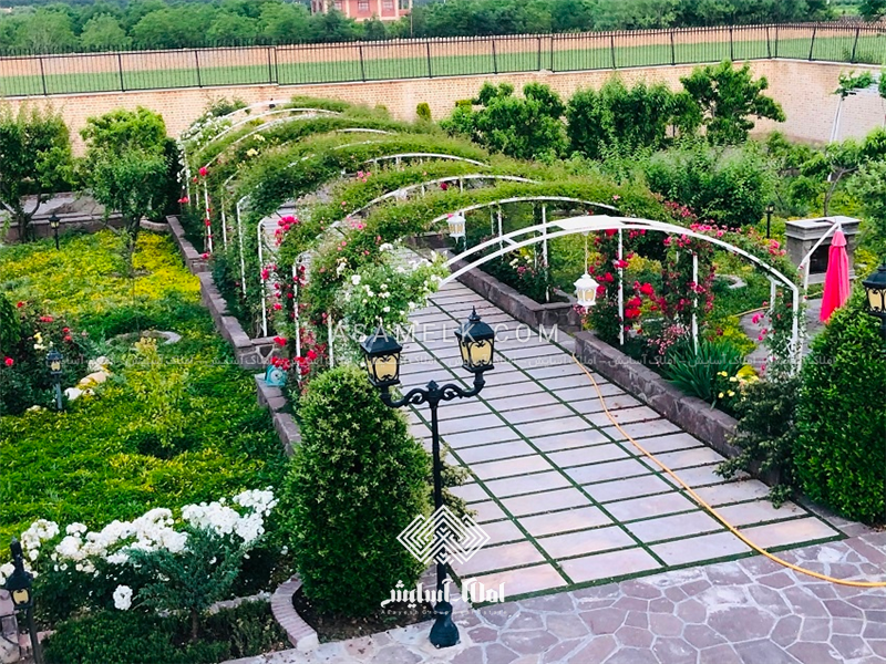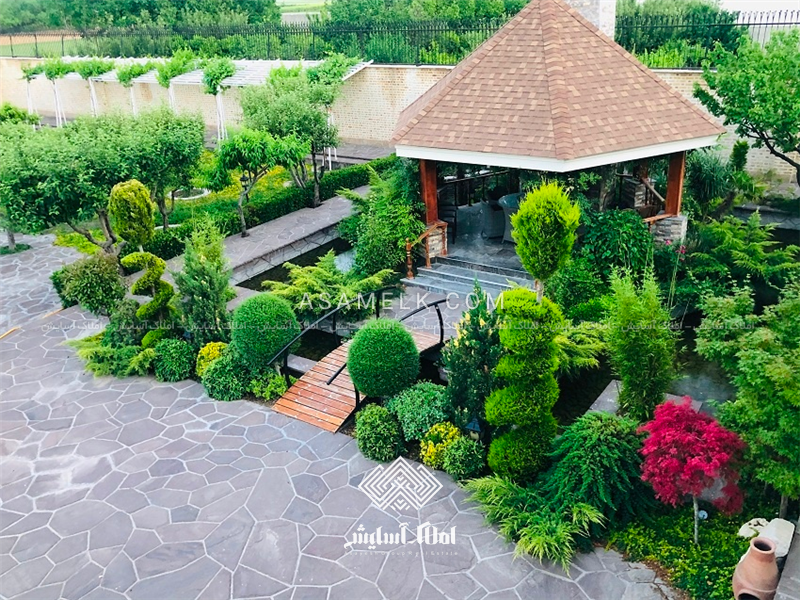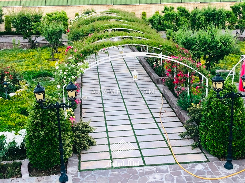 محوطه بسیار جذاب و دیدنی بهمراه درختان تزیینی و چمن آرایی