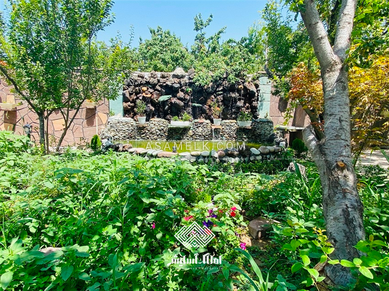 آبنمای سنگی بزرگ بهمراه برکه نیلوفرآبی در گوشه ای از باغ ویلا