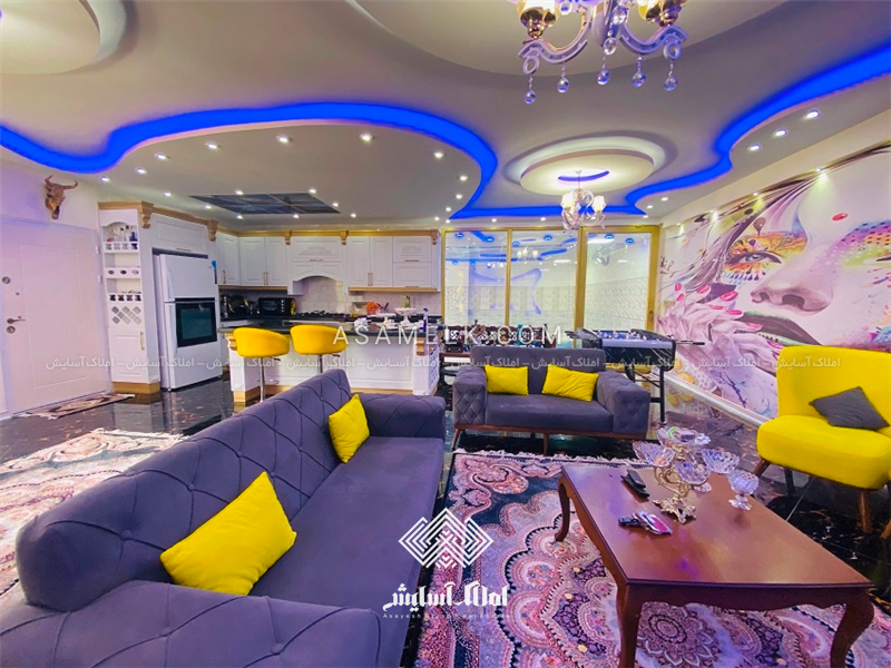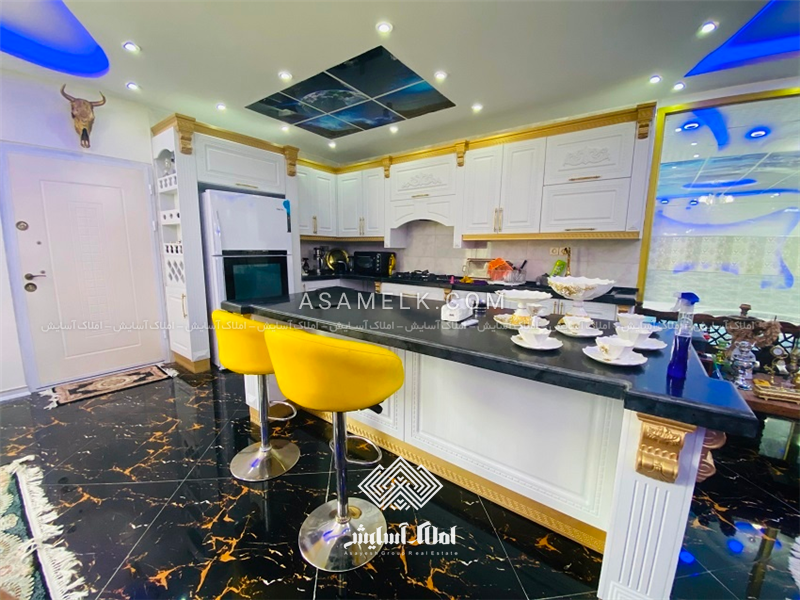 آشپزخانه مجهز دارای گاز رو میزی و یخچال و فریزر و ماشین لباسشویی بهمراه بهترین نوع کابینت ممبران