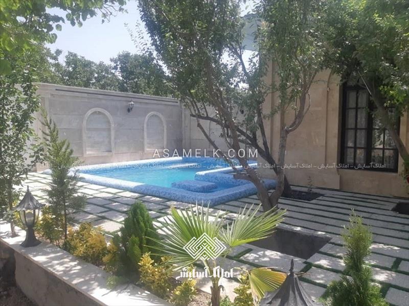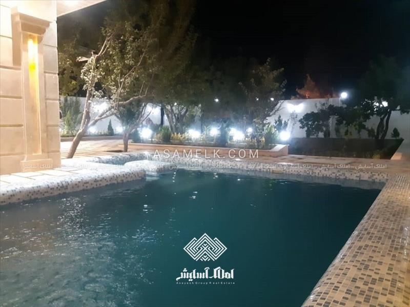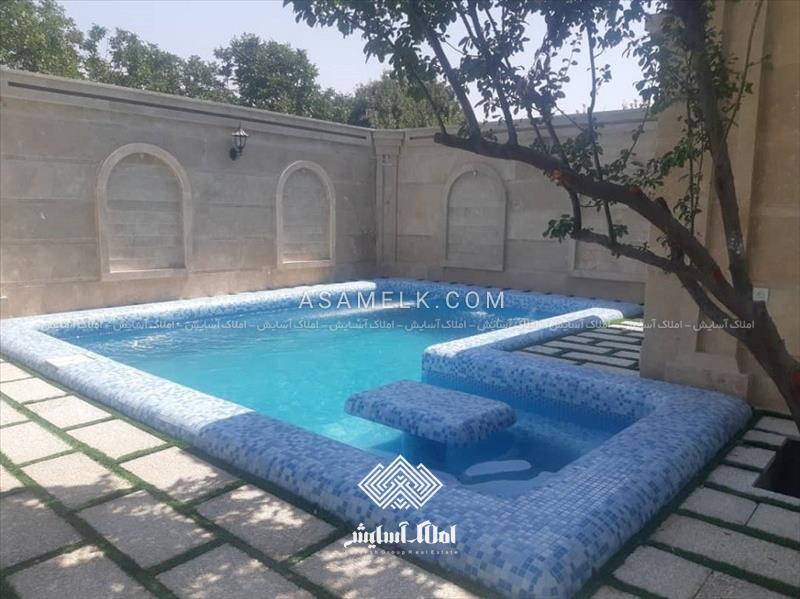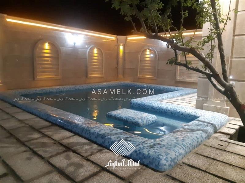 استخر روباز کاشی کاری شده همراه میز بار در مجاورت ویلا