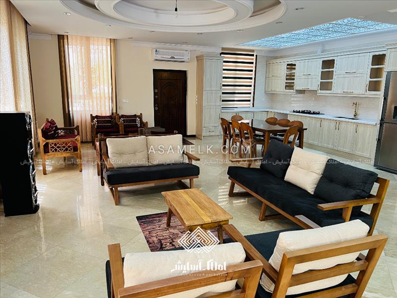 - سالن پذیرایی بزرگ مبله ، آشپزخانه با کابینت های های گلاس ترک و گاز رومیزی و هود لمسی