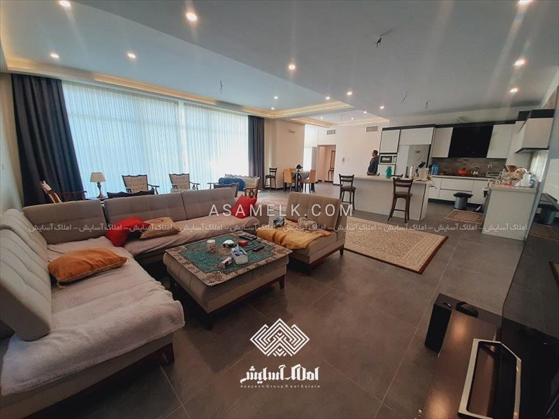 - سالن پذیرایی بزرگ و آشپزخانه با کابینت های گلاس ترک , گاز رومیزی , هود لمسی و یخچال فریزر