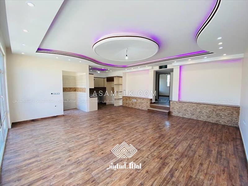 - سالن پذیرایی با کف پارکت و آشپزخانه با کابینت های گلاس، گاز رو میزی و هود
