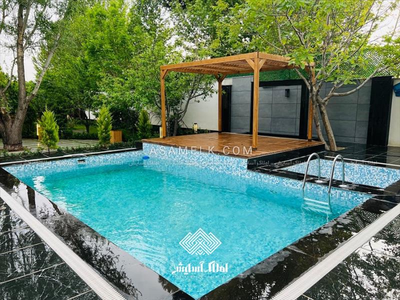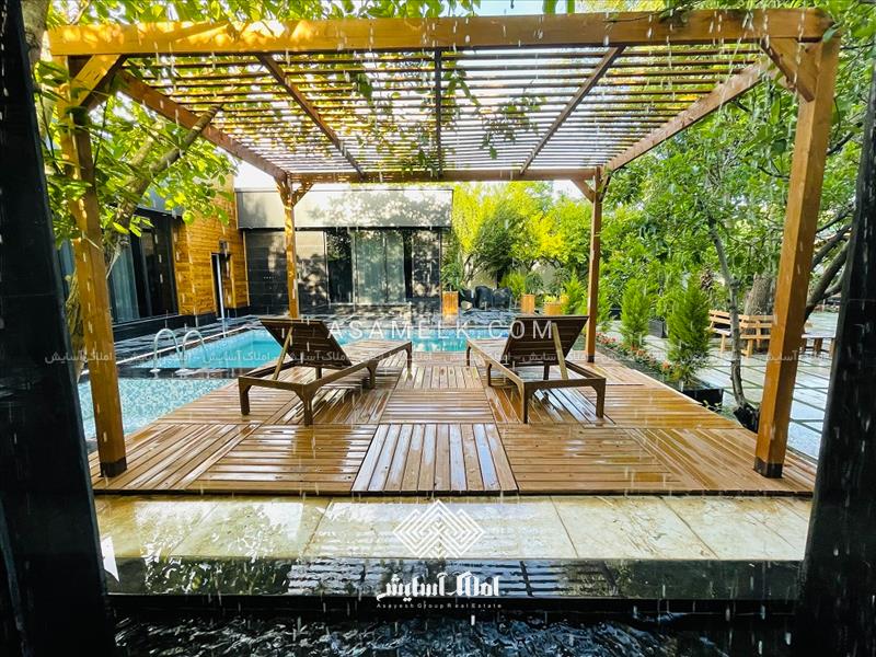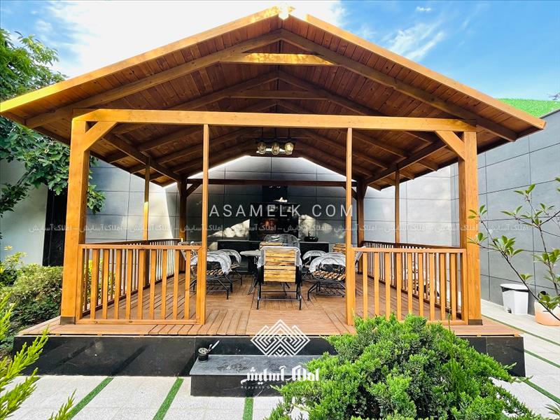 - آلاچیق پرگولا در مجاورت استخر و آلاچیق تمام چوب همراه با باربیکیو