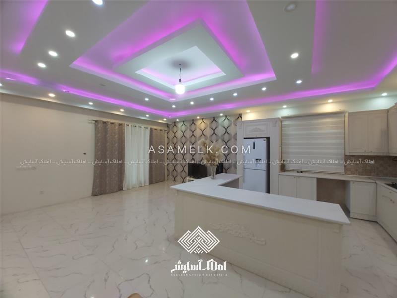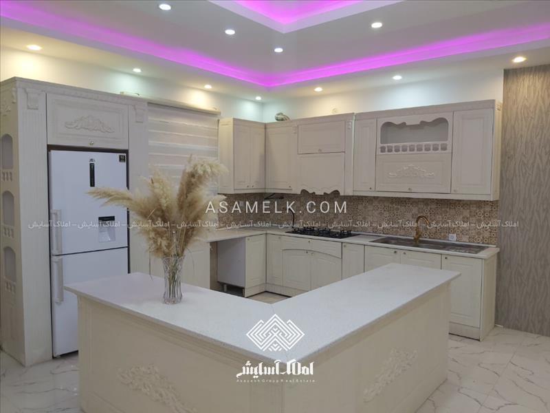 - آشپزخانه با کابینت ممبران و سالن بزرگ و نورپردازی شده و کف سنگ درجه یک