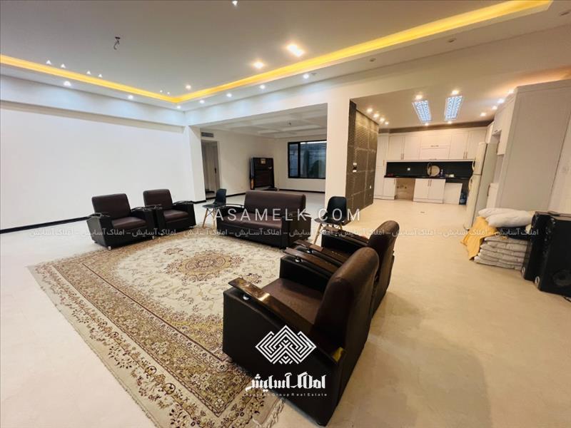 - سالن پذیرایی بانورگیری عالی و آشپزخانه با کابینت های گلاس