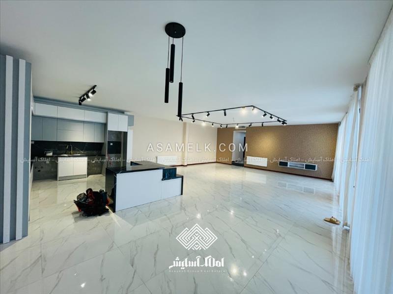 - سالن پذیرایی با نورپردازی زیبا و آشپزخانه با کابینت های گلاس