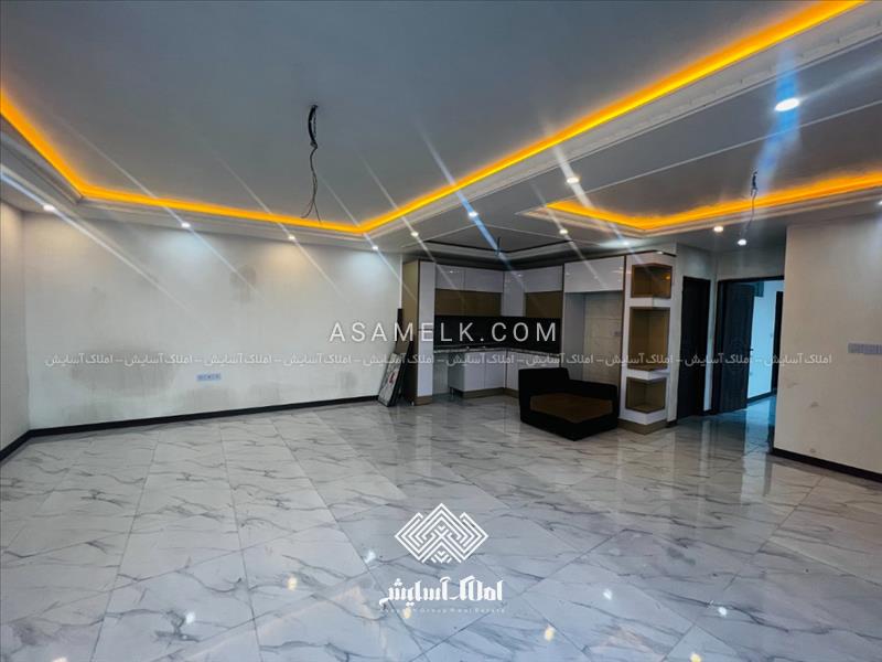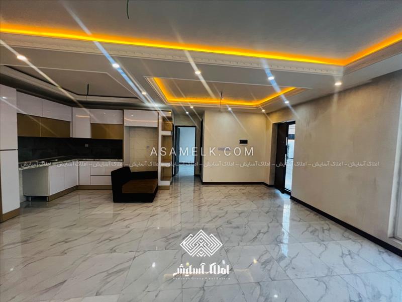 - سالن پذیرایی با نورپردازی زیبا و شیک و آشپزخانه با کابینت های گلاس