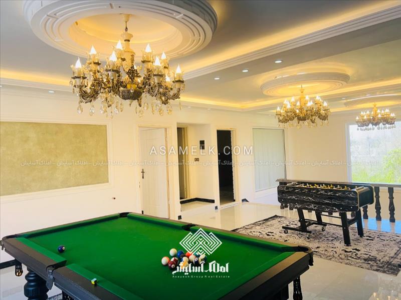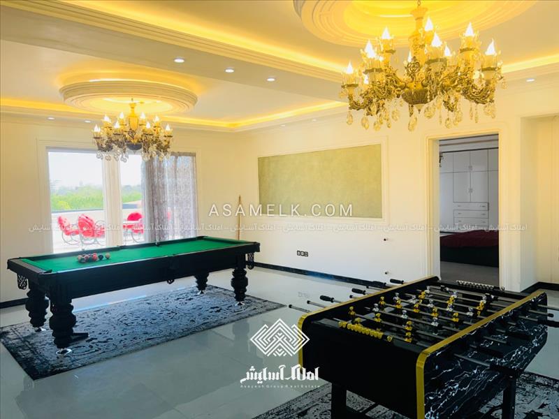 - طبقه فوقانی ویلا شامل:سالن پذیرایی همراه با میز بیلیارد و فوتبال دستی، سه اتاق خواب مستر (سه خواب سرتاسر کمد دیواری)، تراس بزرگ همراه با باربیکیو و مبلمان باغی با چشم اندازی عالی