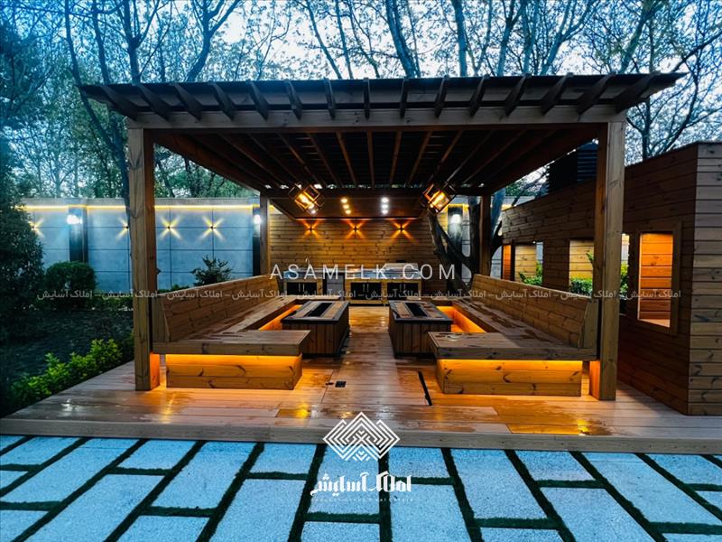 - آلاچیق چوبی و نشیمن گاه زمستانی همراه با باربیکیو و سینک ظرفشویی