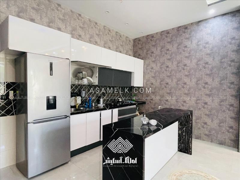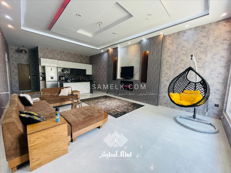 - سالن پذیرایی مبله و آشپزخانه با کابینت های گلاس