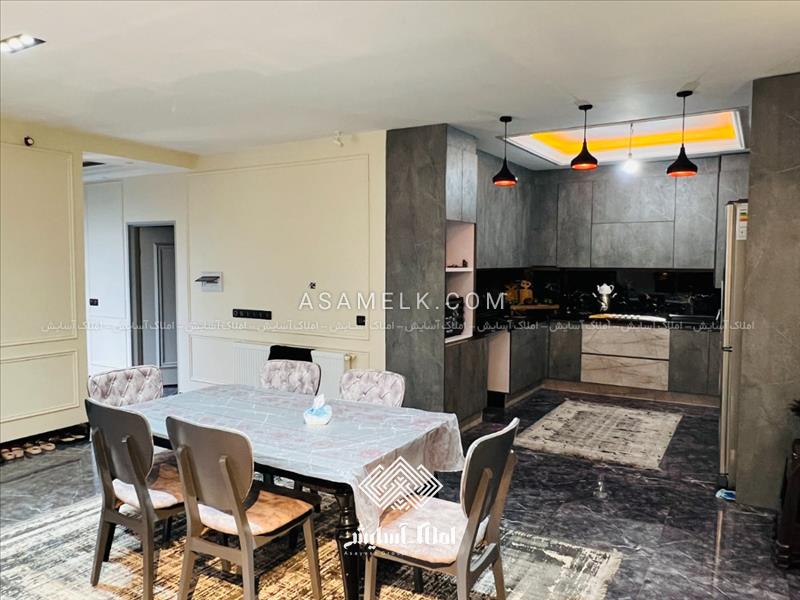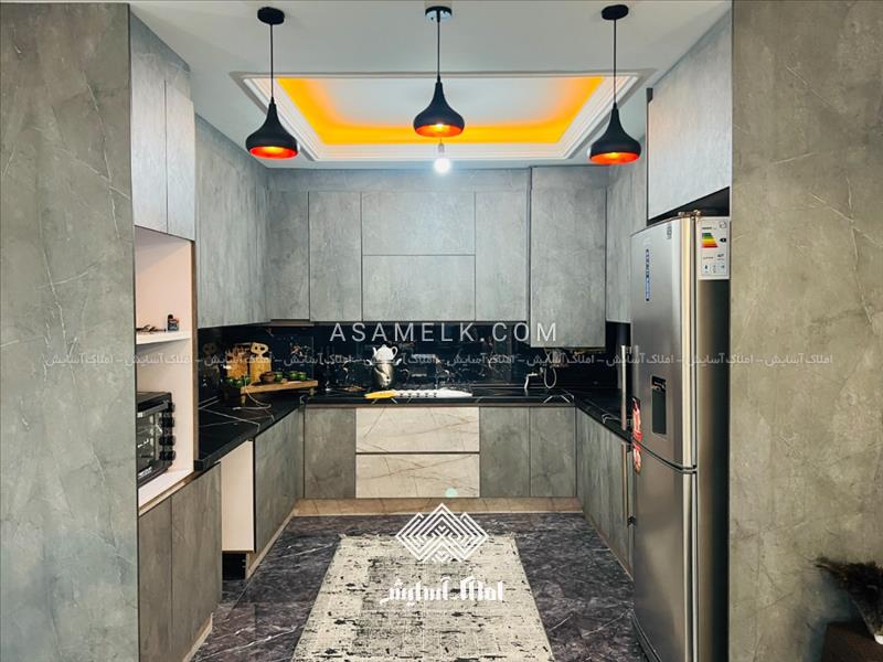 - سالن پذیرایی مبله و آشپزخانه با کابینت هاس گلاس