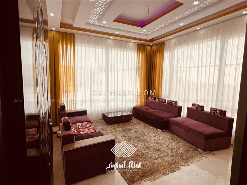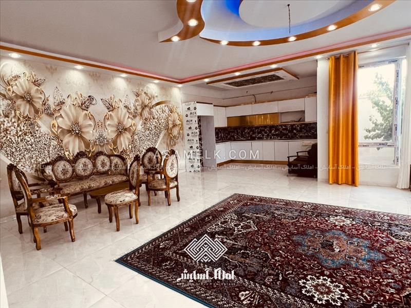 - سالن پذیرایی مبله و آشپزخانه با کابینت های گلاس
