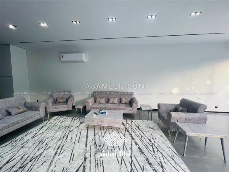 - سالن پذیرایی مبله و آشپزخانه با کابینت های گلاس