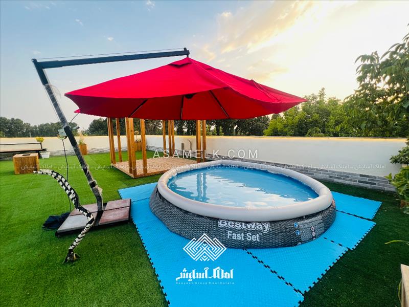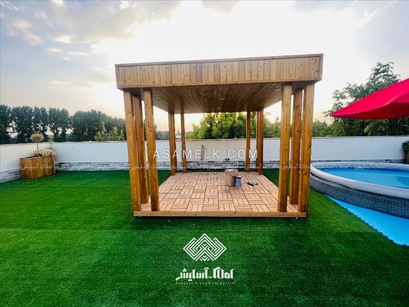 - روف گاردن بزرگ و چمن کاری شده همراه با آلاچیق چوبی و استخر بادی کوچک و سایبان چتری