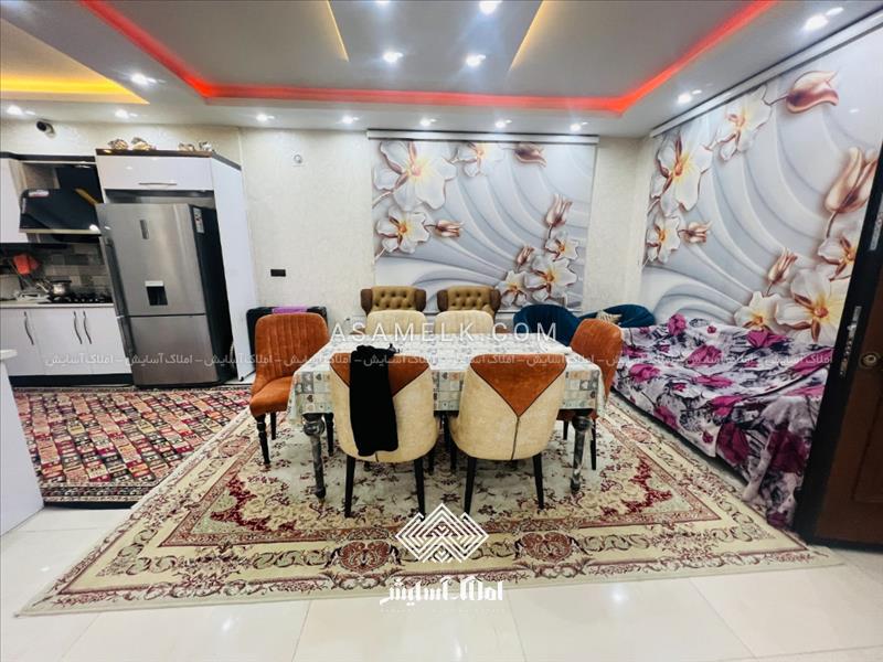 - سالن پذیرایی مبله و آشپزخانه با کابینت های گلاس
