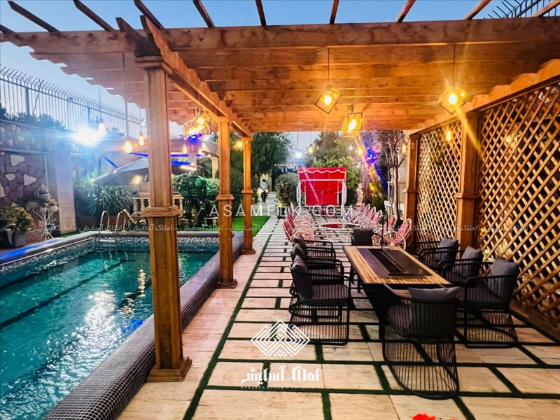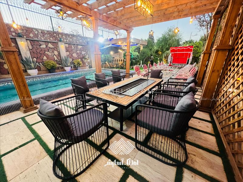 - آلاچیق پرگولا و نشیمن گاه زمستانی با مبلمان باغی و باربیکیو در مجاورت استخر