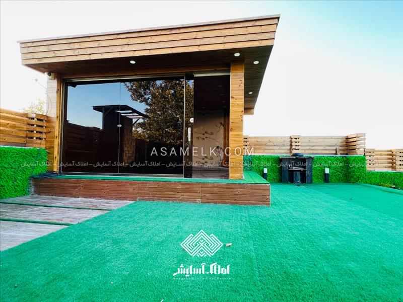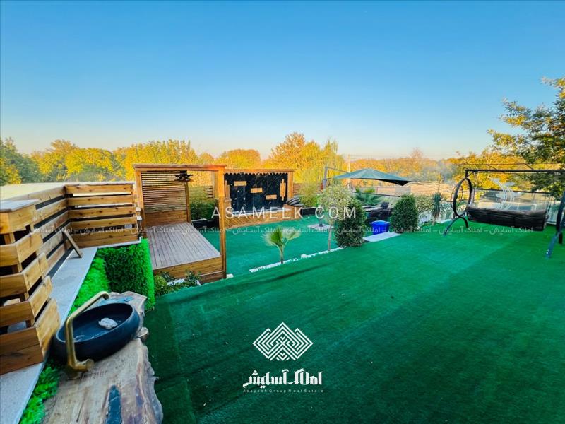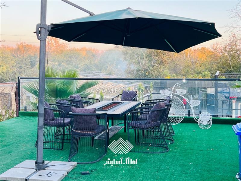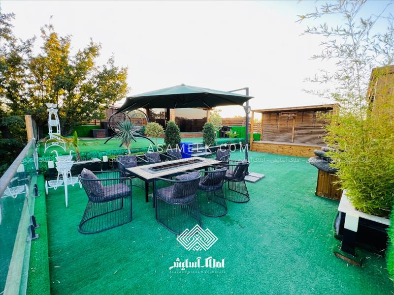 این ویلا لاکچری در خوشنام همچنین دارای روف گاردن با چشم انداز بینظیری به باغات اطراف می باشد و امکانات آن شامل : آلاچیق شیشه ای ، باربیکیو زغالی و گازی ، آبنمای سنگی ، تاب و مبلمان فرنیش و همچنین چمن مصنوعی است.
