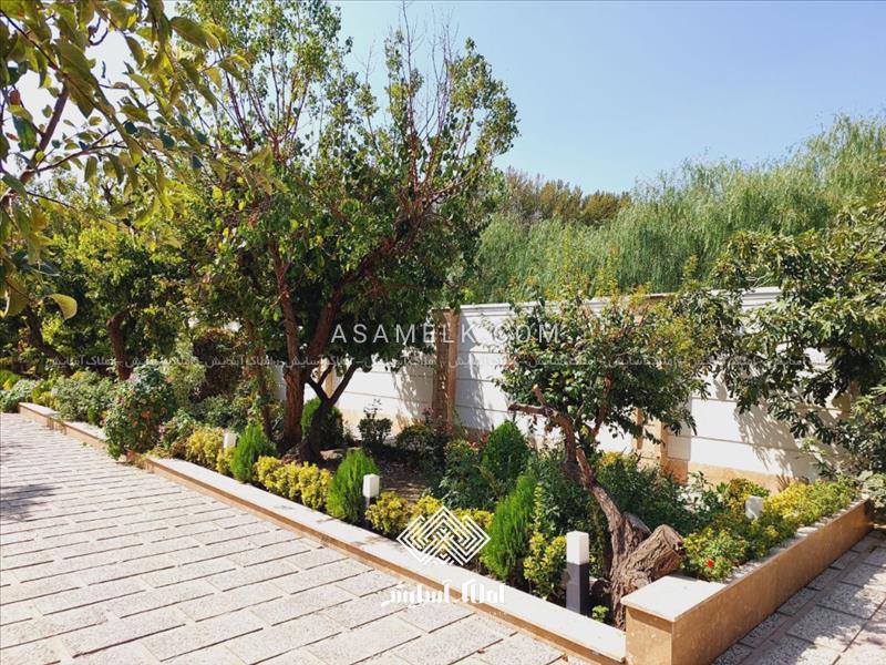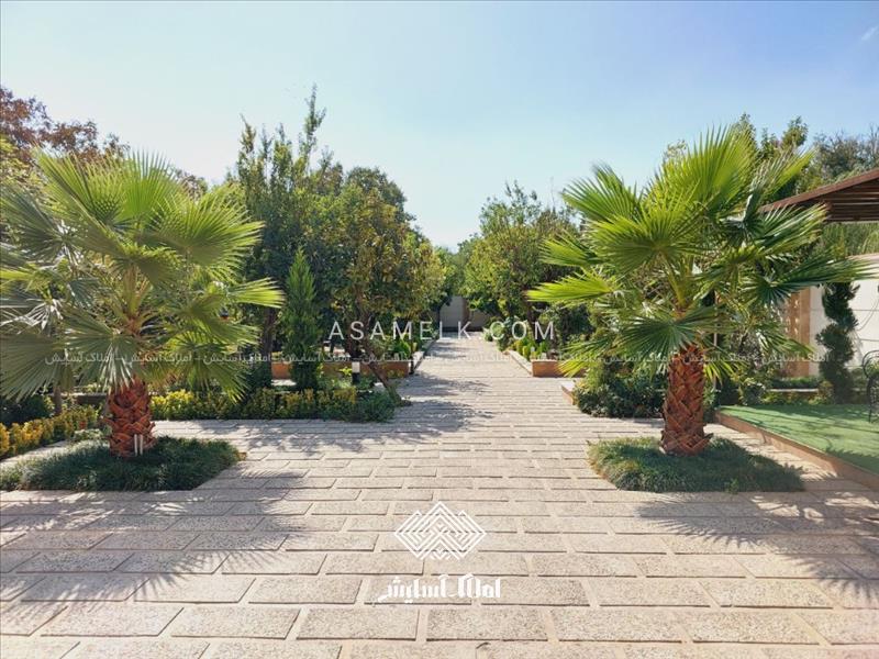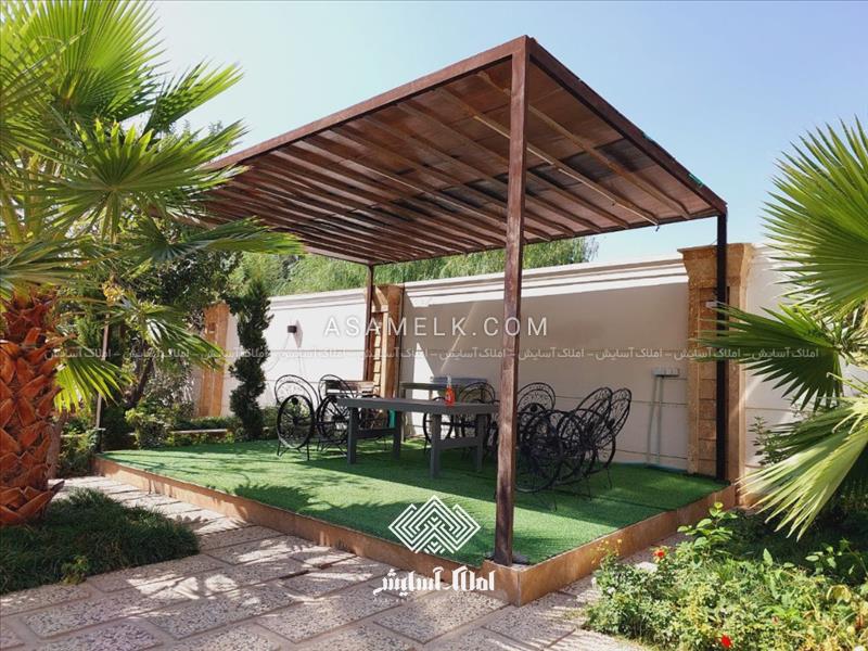 محوطه سازی شکیل و زیبا با درختان زینتی و درختان میوه و دارای آلاچیق در مجاورت ویلا
